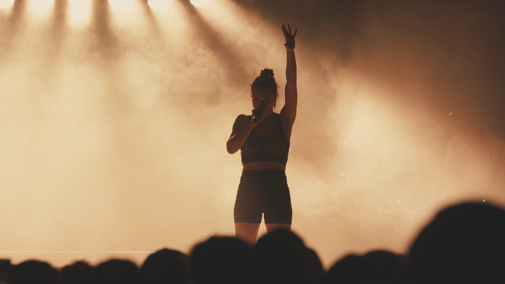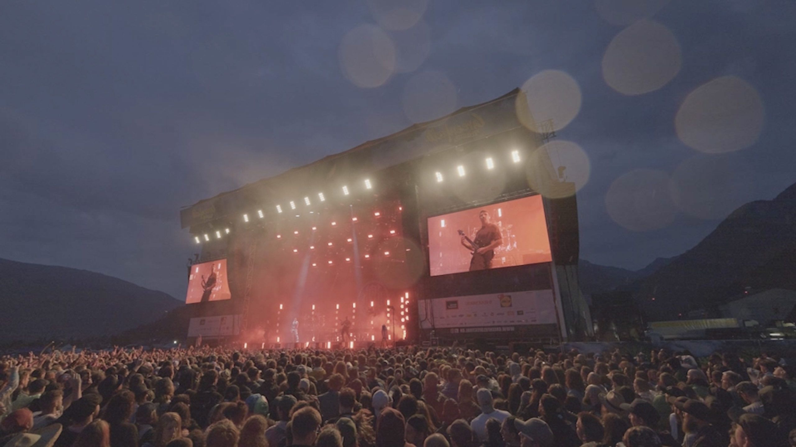 Au milieu, une caméra plan large de la scène avec artistes, musiciens et premières rangées du public.